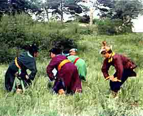 只在三年舉行一次的氏族會議上跳的舞蹈。是一種祭祀性的氏族舞蹈。一般由11人跳,10人圍成一圈,有1人站在圈中央。舞蹈開始后,大家先開始蹲著做小蹦跳的動作,之后站起來,外圍的人手拉手邊跳躍邊向左圍繞圈中央的人轉,中間的人邊舞邊唱,外圍的人隨聲應和。跳這種舞時,男女老少都參加,并著節日的盛裝,有的還要帶上假面具。