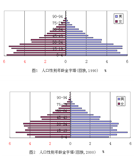 從各年齡段的人口比例看,少年兒童人口(0-14歲)比重為 27.32%,勞動年齡人口(15-64歲)比重為66.98%,老年人口(65歲及以上)占5.69%,與1990年相比,少年兒童人口比重下降了4.67個百分點,勞動年齡人口比重和老年人口比重分別增加了3.48和1.18個百分點。 1990年和2000年回族人口的性別年齡結構如圖1和圖2所示。