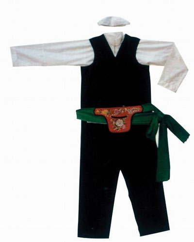 青年男子愛穿白色的對襟汗褂,腰系紅布帶或繡花腰帶,外套適體的黑色短坎肩,黑白對比鮮明,顯得清新、干凈而又文雅。結婚時,腰束用紅、藍緞子縫制并繡有各種花卉圖案、綴有繡帶的“繡花圍肚”,腳穿繡花襪子和布便鞋。