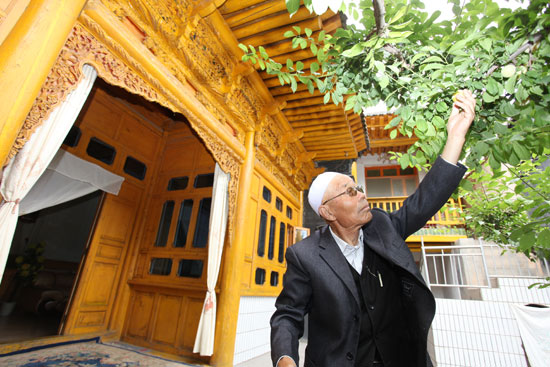 在自家的撒拉小院里程種的三株杏樹成熟了,韓占祥新手摘杏款待朋友