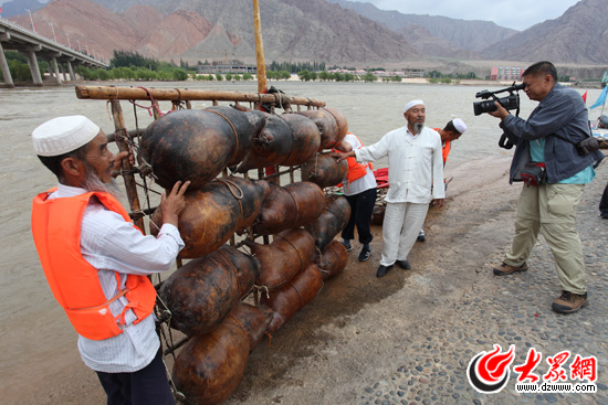 采訪團(tuán)李東岳老師用手中的攝像機(jī)記錄撒拉族非常有特色羊皮筏子。