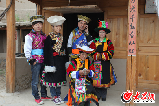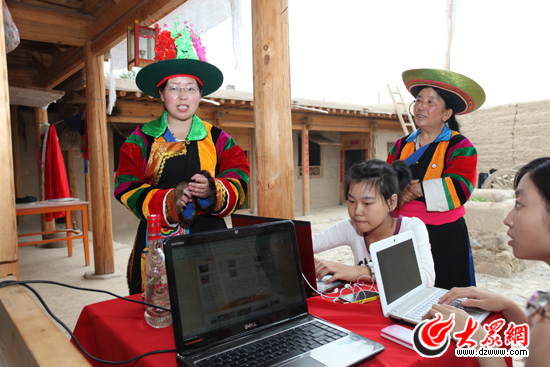 小記者在采訪土族阿姑。戴眼鏡的阿姑名叫喬領(lǐng)兄,26歲,大學畢業(yè)后還未找到工作,就先到“彩虹部落”跟董思明展示土族婚禮。她說她現(xiàn)在喜歡這份工作了。