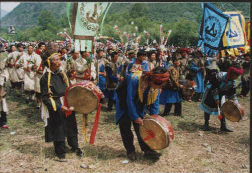 整個祭山會由釋比指揮,依序進(jìn)行。如祭山會前,即派人在塔子前供奉祭器、祭禮、香燭等用具。林子周圍遍插五色彩旗,布置祭壇。參加祭山會的人,穿著節(jié)日盛裝,攜帶事先準(zhǔn)備好的刀頭肉、白酒和三角形或新月形的面饃,還要捎帶一些柴火和白石,安放在祭祀坪白石神塔前。此時,會首(現(xiàn)為村長、族長)業(yè)已準(zhǔn)備好一頭黑色公羊(還大愿時準(zhǔn)備公牦牛一頭)、一只紅公雞、一壇酒、一個大三叉饃饃以及刀頭肉,一斗糧食等物。祭山會開始,會首在祭祀塔前“煨桑”祭天,隨后人們也將隨身攜帶的松枝柏拋進(jìn)煨桑爐里,或在冒煙的柴堆上撒些五谷雜糧、白酒等。以示酬神還愿,祈求吉祥。此時,釋比上場,他頭戴猴頭皮帽(帽上綴有九個小海貝),帽前綴以長有大獠牙的兇惡神像(類似吞口),腰佩法刀,手持響盤、羊皮鼓,并持著人頭形手西斗(拐杖)走在祭山隊(duì)伍的前面。其后一幫徒弟,手敲法器或持掛有五色彩紙的杉枝(十卓)緊隨其后。其它參加祭山會的人眾,亦尾隨釋比,在法器、樂器和鞭炮聲、火枌聲中步入會場。