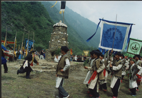 祭山會,羌語“蘇布士”,也叫還愿會、塔子會、山王會。一般在羌祭的神林中,祭祀坪中舉行。羌寨民居(含碉樓)一般擇筑在半山腰或山脊上,這是由于古羌時期,戰(zhàn)爭頻繁,羌族累遭官兵清剿或外族侵?jǐn)_。擇此種地形建寨,易守難攻,便于退入山上森林,因此每個寨子背后山上都有一片森林,作為屏障,佑護(hù)山寨。故羌人可稱其為神林,倍加愛護(hù)。而且在神林的壩子里,往往用白石壘成一個塔形石堆,在上面矗立著巨大、雪白的白石(石英石)作神祗供奉。也有在羌寨周圍的山坡上,專辟一塊如籃球場大小的平地為祭祀坪。在茂縣黑虎寨的山脊平地上就有專供祭祀的祭祀坪一個。在祭祀坪北端筑有一山王塔。塔的中部有爐堂,專供“煨桑”之用。石塔頂上有一高約二尺、粗約十公分的石柱,石柱頂上供著一塊“白石”,代表天神、山神,供人們祭祀膜拜。