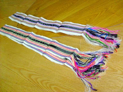 畬族姑娘長到六、七歲時,母親就教授她織彩帶。彩帶以絲線編織為主,也有用棉紗或苧麻編織的。織彩帶沒有特制的織帶機(jī),屋內(nèi)屋外乃至山野都可編織。若在屋內(nèi)編織,就把 絲線的一端拴在凳腳、桌檔或屋柱上,另一端系在自己的腰間,坐 在凳上編織。要是在山野編織,可把絲線的一端拴在小樹桿或樹樁上,另—端仍束在腰身,坐在地上或跪在地上編織。