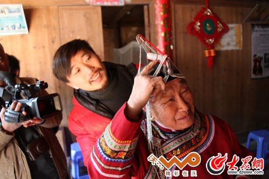 藍(lán)陳契大媽向記者展示畬族的頭飾。