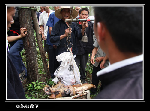 參加“敬霞”的每支宗族不管人多少、不分貧富大家出錢購(gòu)買120斤的大豬,“敬霞”開始前要過秤,多的不要,同時(shí)規(guī)定參加霞節(jié)的每個(gè)宗族內(nèi)不能通婚。詮釋了古時(shí)的水家人就有富人和窮人要平等、近親通婚不好的理念。