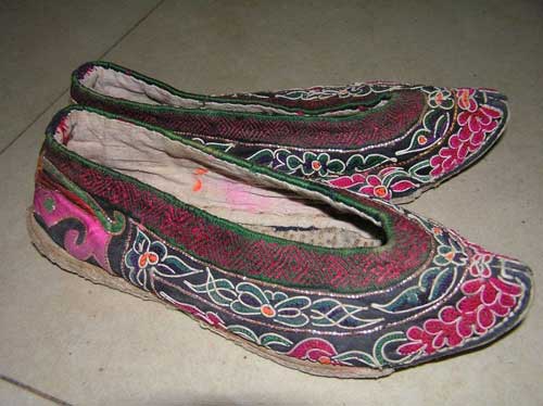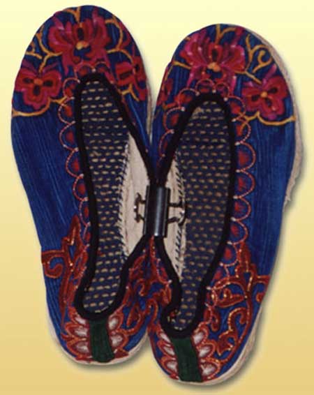 另一種采用"馬尾繡"的方法,鞋尖呈尖形往上翻翹,鞋幫上先用裹馬尾的白絲線成底色圖案,卷曲成各種幾何圖案拼鑲在鞋幫上,圖案為花卉、云朵等紋樣。刺繡精美,做工講究。