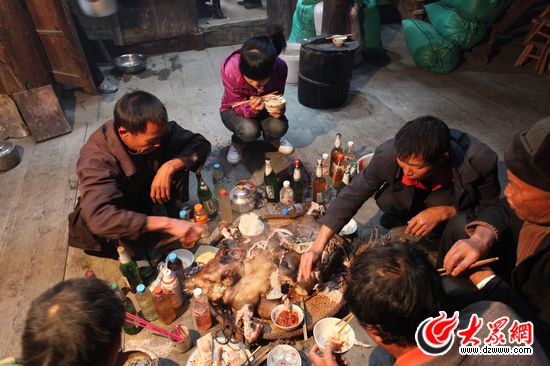 韋桃花回到三洞鄉(xiāng)板龍村的老家里的老宅,為祈求平安發(fā)財請水書先生做法事。祭祀用的小香豬在儀式結(jié)束后成為前來幫忙的親朋鄉(xiāng)鄰的腹中美味