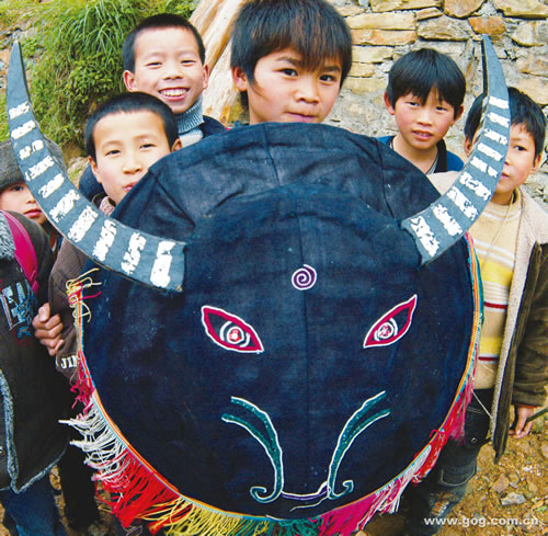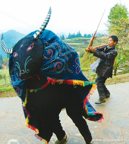 自己縫制的牛角是斗角舞最關(guān)鍵的道具。頭頂牛角,穿上黑色的披風(fēng),伴著蘆笙節(jié)奏,邊舞邊斗,猶如水牛在田中玩鬧、打架,動作剛健英武。因此,這里的水族人形容這個舞蹈,一般都形象地說“打得精彩”。雖然這是祖輩傳下來的舞蹈,但也不是人人都能學(xué)的,按韋支書的說法:一要受得了累,二要懂點技巧。村里會“斗角”的也就40多人,但是“打得精彩”都是年輕人。如今,年輕人大都外出打工了,也只有過春節(jié)的時候寨子里斗得最熱鬧。