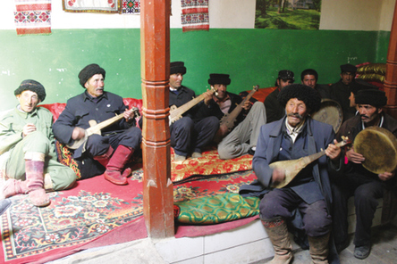歌手們都是60歲以上的老人,但當(dāng)他們唱起古老的塔吉克民歌時(shí),個(gè)個(gè)都是那樣深情,仿佛忘記了自己的年齡。只要鷹笛、手鼓、熱瓦甫等樂(lè)器一響,歌聲就隨之而起,老人們唱到激動(dòng)時(shí)就站起來(lái)手舞足蹈,那些古老的民歌好像又把我們帶到了那古老的年代。