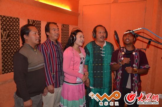 茶紅明在昆明錄音棚內與徒弟們錄制他的新碟。