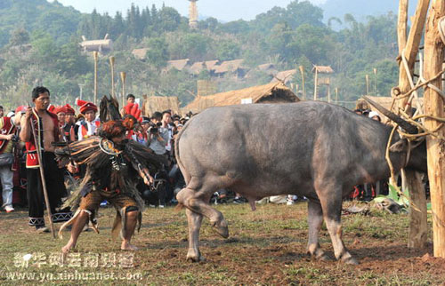 后來,由于水牛與人類(佤族)有著十分密切的關系,水牛在生產生活中給予人類(佤族)較大貢獻。于是佤族就把水牛當作了自己的吉祥物,去崇拜它。由于水牛的價格比較昂貴,絕大多數人家都沒有能力購買,更談不上舉行鏢;顒恿恕K,牛頭就成了財富的象征。當舉行重大活動時或者當部落與部落之間解決矛盾和糾紛時,就把水牛作為慶祝活動最好的吉祥物,都要舉行盛大的鏢;顒樱⒄埓逭锉容^有威望的頭人,選好供奉水牛頭的地方,把水牛的頭好好地保存起來,這就是所謂的“龍摩爺”(佤語:意為供奉牛頭的圣地)