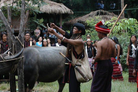 鏢牛儀式既莊嚴(yán)又神秘。所用的水牛經(jīng)過挑選,都是強(qiáng)壯的黑色公牛,一是佤族崇拜黑色,二是祭祀用的必須是水牛頭。在他們看來,大角牛頭是神圣之物,是財(cái)富地位的象征,是供奉神靈的祭品。拴牛儀式開始,低沉悲壯的牛角號(hào)奏響、大木鼓敲起。副鏢手帶領(lǐng)佤族男子將兩頭牛牽到牛樁前用繩子拴好,然后互相巧妙配合,拋繩哄牛,既要用繩子把牛蹄栓住,又要躲避它防止被牛踢傷。緊接著,主持人宣布“請(qǐng)頭人向鏢手授鏢槍”,鏢牛手在魔巴的帶領(lǐng)下走向前,接受鏢槍和敬酒,左手持鏢槍,右手拿杯喝干敬酒,在魔巴帶領(lǐng)下返回鏢牛場(chǎng),鑼鼓歌舞隊(duì)更加熱烈地敲鑼打鼓、載歌載舞。緊接著,主持人宣布“請(qǐng)頭人向鏢手授鏢槍”,鏢牛手在魔巴的帶領(lǐng)下走向前,接受鏢槍和敬酒,左手持鏢槍,右手拿杯喝干敬酒,在魔巴帶領(lǐng)下返回鏢牛場(chǎng),鑼鼓歌舞隊(duì)更加熱烈地敲鑼打鼓、載歌載舞。