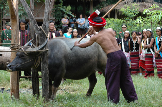 [提要] 當(dāng)主持人宣布“鏢牛祭拜司崗里開始”時(shí),佤族群眾便吹響牛角號(hào)、敲響大木鼓。鏢牛結(jié)束后,用牛頭祭木鼓和司崗里。牛被鏢倒 安排人員剖開牛腹,取出內(nèi)臟,分割牛肉,參加活動(dòng)的見者有份