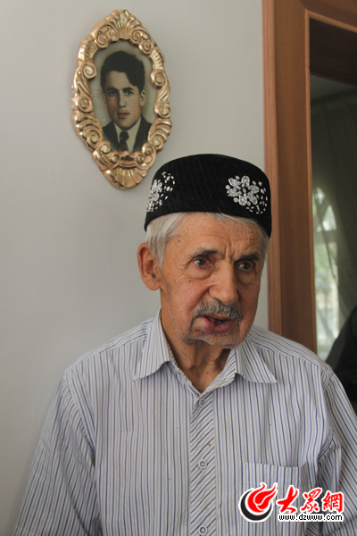 背后的墻上掛著老人年輕時意氣風發的照片。