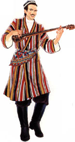 “袷袢”,喜用彩色條狀綢作面料,這是一種深受歡迎的傳統式衣料名“切克曼”,其次是“拜合散”,它織造細密,衣質輕軟,是縫制“袷袢”的好面料。年老的以黑色、深褐色等布料裁制,顯得古樸大方。下身多著青色長褲,蓋及腳面。講究的男褲,則在褲角邊繼飾花卉紋樣,多以植物的莖、蔓、枝藤組成連續性紋飾,顯得雅致美觀。