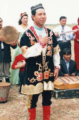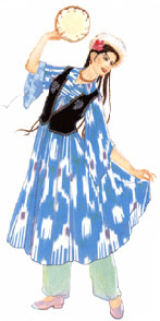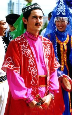 現代的維吾爾族民族式男裝,是以“袷袢”式服飾為主要款式。與古代形式雖然相似,但現代的民族服飾講究面料的質地,式樣寬松合體,典雅大方。式樣多以長外衣過膝,對襟、長袖過手指、無領、無鈕扣,一攏腰巾束系既緊身連體,又舒暢保暖。