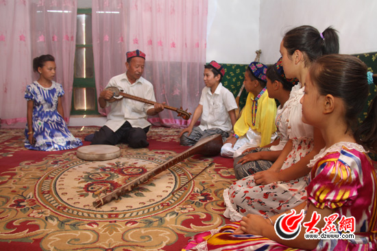 吐爾遜·司馬義老人在教孩子彈唱吐魯番十二木卡姆。