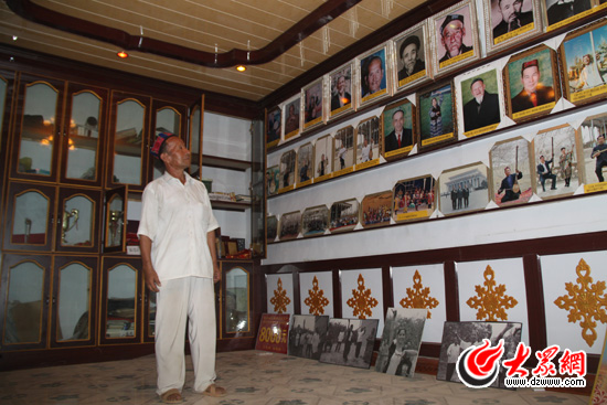 跟著老人抬腿邁進去,突然燈打開了,這間十平米左右的屋子三面墻上赫然掛滿了幾十張各個時代的木卡姆傳人的照片,西邊則全是櫥柜,里面全是老人的獎牌和獎杯,以及木卡姆的樂器、曲譜。這里就是吐爾遜·司馬義老人自己的木卡姆家庭博物館了。