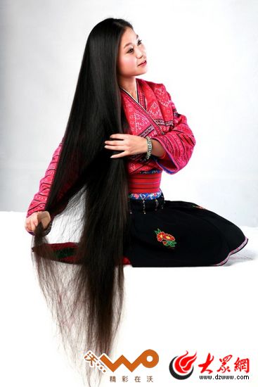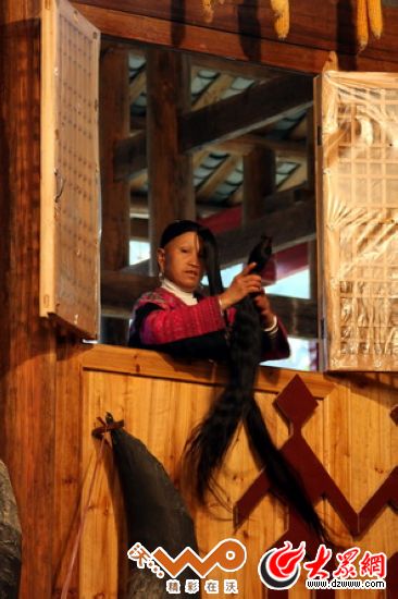 紅瑤婦女愛美出了名,愛蓄長發也出了名,她們以長發為美,從七八歲就開始蓄發,十七八歲的姑娘長發就有一米以上。九年前我采訪的黃洛瑤寨僅有68戶人家,頭發超過一米的婦女就有60多位,最長的達1.8米,以“集體長發之最”被收入世界吉尼斯紀錄。
