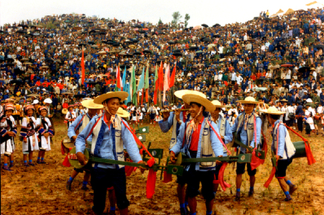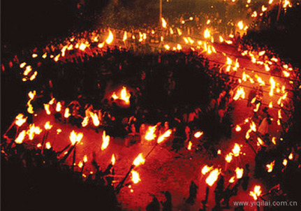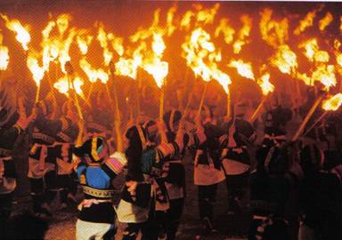“火把節”,在每年的農歷六月二十四日舉行。關于它的來歷在漢文文獻中也有記載。彝族民間有種種傳說。彝族人民是這樣傳說的:“在很古很古的時候,彝鄉人民迎來了金秋的收獲季節,眼看就要豐上了,可是天王恩澤古茲不愿讓彝族人民過上好日子,派十大力來到彝山,把所有的莊稼都踏壞了。彝族人民滿腔憤怒,從人群中走來一個名叫包聰的小伙子,要跟十大力斗個高低。包聰與十大力拼搏了三天三夜,終于戰勝了 。十在力灰溜溜地低下頭,變成了一從禿山。天王惱羞成怒,就撒下了一把灰粉,霎時間變成了數不清的害蟲,像一片烏去遮住了太陽紛紛落到彝鄉危害莊嫁,眼看一年的辛苦就要落空了,彝族人民每人舉起一把火,把所有的害蟲一燒而光,奪得了大豐收。從此每年六月二十四日這一天,就成了彝族人民點火把除惡滅害,盛慶豐收的傳統節日。”