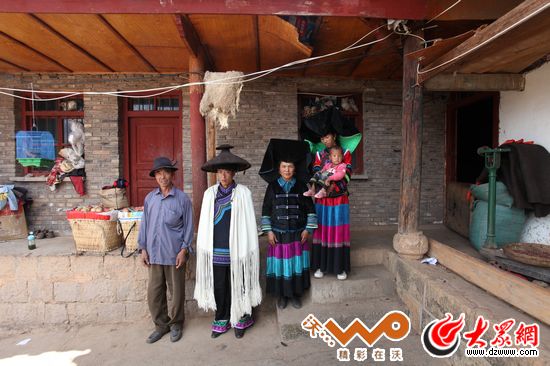 阿余雙體與父母及弟媳在房前合影。他們身后的羊皮,是老畢摩阿余洋架去世時“開路”時殺的羊,這張皮不能賣,一直在房檐下這樣掛著。
