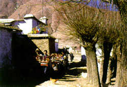 藏歷元月,是節(jié)日最多也最隆重的月份,在這個月里,幾乎天天都在過節(jié)。新年是人們最看重的節(jié)日,是一年中最隆重的節(jié)日。拉薩地區(qū)的人們,從藏歷的十二月份就開始做過新年的準(zhǔn)備。從十二月中旬開始,每家每戶都會炸“卡賽”——一種用酥油和面粉制作的油果子。油果子的形象千奇百怪。同時,每家還要準(zhǔn)備一個叫“切瑪”的木制彩色五谷斗,裝滿糌粑、麥粒、蠶豆、人參果等,上面還要插上青稞穗、雞冠花、日月牌等,并點綴上小塊酥油。炸好的“卡賽” 和做好的“切瑪”當(dāng)作供品放在神像面前。到了這個月的二十八九,家家戶戶會把屋中的神龕、家俱擦得干干凈。有些人家甚至不辭辛苦,將自己的院落粉飾一新。在打掃干凈的灶房正中墻上或門前空地上,還用糌粑粉涂上吉祥的圖案。到了二十九的晚上,家家戶戶團(tuán)團(tuán)圍坐吃一頓“面疙瘩宴”,藏語叫做“古突”。這些面疙瘩被包上了諸如石子、羊毛、木炭、辣椒等多種蘊(yùn)含不同意義的東西,無論吃到哪種東西總會給家人帶來一陣歡笑。吃完面疙瘩,家家戶戶傾巢出動去舉行隆重的送鬼儀式,一時間,整個拉薩城出現(xiàn)了壯觀的場面:端著鬼食盆的人在前面奔跑,舉著火把的人在后面緊追,直到鬼食盆被摔爛在熊熊燃燒的青稞秸堆里。第二天,也就是新年的第一天,天還不亮,各家的主婦紛紛到河邊背回“吉祥水”,全家人享用“吉祥水”熬出的粥和其他早已準(zhǔn)備好的食品,然后家人都穿戴一新,迎接黎明。初一這天一般是家人團(tuán)聚的日子,人們早早起床,穿上新衣,首先祭拜神靈,然后手捧五谷斗和青稞酒互相拜年,說一些吉祥的祝詞,接下來開始喝頭天做好的熱青稞酒,吃麥片吐巴和酥油煮的人參果。年初二,親友開始互相拜年。初三,人們還蜂擁至東郊的寶瓶山和西郊的藥王山,煨桑,插經(jīng)旗,掛彩幡,祈求山神和水神賜予幸福平安。整個節(jié)日期間,被歌舞籠罩、鞭炮喧染的拉薩城沉浸在歡樂、祥和和喜慶的氣氛中。