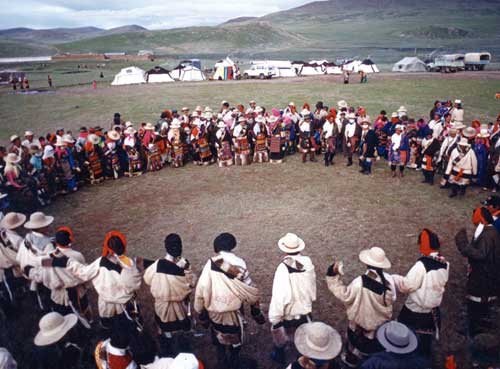 而山南地區(qū)《果諧》的形式,卻是先由各站半圈的男女在輪流歌唱,沿逆時(shí)針方向行走到歌唱結(jié)束,才在領(lǐng)舞者“諧本”發(fā)出的“休休休休!”或“次次次!”的叫聲后開始舞蹈。舞蹈一經(jīng)開始,就只見男女舞者分別以極快的節(jié)奏輪流跳著一段段舞蹈,似乎是在進(jìn)行男女舞隊(duì)之間舞蹈速度的比賽,令人緊張而興奮。直到這種熱烈的快速舞蹈進(jìn)行數(shù)遍后,領(lǐng)舞者在眾人舞蹈的同時(shí),加入一段快速而幽默的“說唱詞”后,大家才在一同發(fā)出歡樂而激動(dòng)的“休休休休!”叫聲中結(jié)束舞蹈。