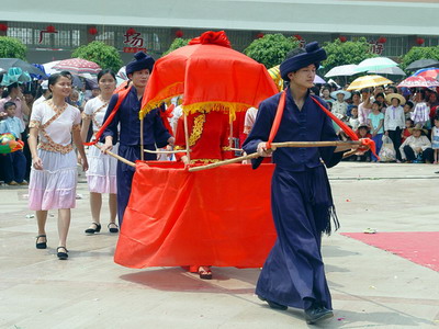 大門的兩邊放“彎刀”或弓箭,新娘用隨身帶的花傘挑開,表示新娘的機智勇敢。金平、河口、元陽的“儂人”、“沙人”,訂婚叫“吃小酒”。結婚頭天,從小與姑娘相處很好的女伴,各自從家中帶著炒黃豆、炒蛋餅送到新娘家共餐,陪新娘邊吃邊唱。彌勒地區互相認識并建立感情后,由男方家請媒人到女方家求親。女方父母同意,就把姑娘的生辰交媒人帶給男方家。如“八字”相符,男方家請算命先生擇算吉日,由媒人轉告女方家,女方家就忙著給姑娘做嫁妝。結婚的頭一天,男方家選1個伙子代表新郎,1個姑娘和兩個年紀較大的男子挑著酒肉到女方家接親。吉日早上,女方家把親戚都請到家中吃一頓“嫁囡飯”,然后從其中選出男女各6人送親。姑娘到了男方家并不和新郎同房,而是跟前來送親的6個姐妹住在一間屋子里。第二天和新郎到酒席上敬酒,第三天回門。待來年裁種季節,由新郎親自到岳母家領回新娘,從此夫妻才共耪田園,長久合一。個舊地區結婚的年齡一般不超過20歲,18歲前父母就為他選擇對象,也有自由戀愛的,但必須征得父母同意,先請兩個媒人去“說親”,叫“討話”。媒人第二次帶著兩塊肋骨肉(又叫“討親菜”)和酒、菜等到女方家要生辰八字合婚。合婚到正式拜堂,要有三次禮儀:
