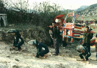每當(dāng)農(nóng)歷正月初一黎明,人們就敲著銅鼓成群結(jié)隊(duì)去田里找冬眠的青蛙。據(jù)說(shuō),先找到青蛙的人是幸運(yùn)的,被譽(yù)為雷王的女婿“螞拐郎”,成為該年螞拐的首領(lǐng)。首領(lǐng)要帶著大家點(diǎn)燃煙炮,以向雷王報(bào)告人間祭螞拐的喜訊。人們把這只青蛙接回村,放入花轎中。由初一到正月底,白天孩子們抬著青蛙游村,向每家每戶賀喜;晚上,則抬到螞拐停下,人們跳螞拐舞和唱螞拐歌,以示為螞拐守靈。守靈、游村的活動(dòng)進(jìn)行到第25天后,螞拐節(jié)便進(jìn)入高潮。這天,人們選擇吉時(shí),抬著花轎到青蛙下葬的地方,打開(kāi)去年葬蛙的寶棺,如果青蛙的骨頭呈金黃色,便預(yù)示今年是好年景,全場(chǎng)頓時(shí)銅鼓齊名,同聲歡呼。如果蛙骨呈灰色或黑色,便表示年景不好,于是人們就燒香祈求消災(zāi)降福。接著舉行新青蛙的的下葬儀式。葬禮之后,男女老少一起圍著篝火唱歌舞蹈,送螞拐的靈魂上天。這一夜,人們盡情狂歡,通宵達(dá)旦。(圖片及部分文字資料來(lái)自中國(guó)非物質(zhì)文化遺產(chǎn)網(wǎng))