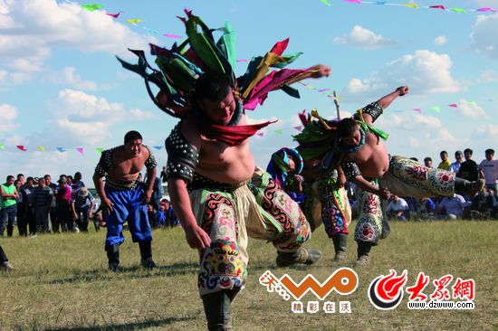 那達慕上的搏克手(蒙古式摔跤),肚子上的彩條圈是“江嘎”,只有在旗(縣)一級的那達慕上獲得三次以上冠軍,才有資格佩帶