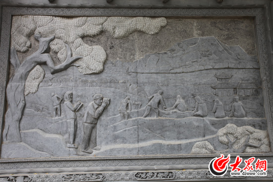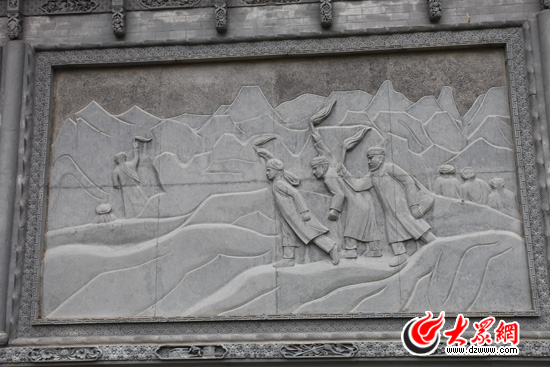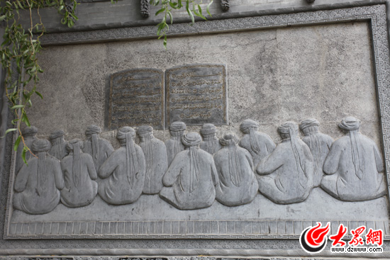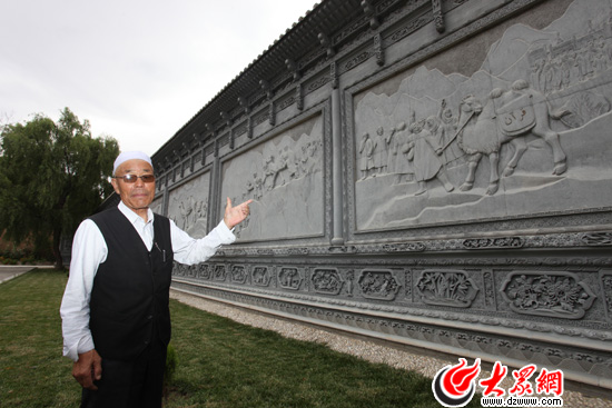 駱駝泉內(nèi)最醒目的是一面長約40米的石雕墻,由八塊石質(zhì)浮雕組成。為什么是八塊呢?韓占祥說:“一,撒拉族東遷歷史是八百年;二,撒拉在滿清有八宮,現(xiàn)在是八個鄉(xiāng)鎮(zhèn);三,街子有六門八戶;四,2008,中國實現(xiàn)了百年奧運夢想;五,中國人最喜歡阿拉伯?dāng)?shù)字8,因此我用8塊浮雕表現(xiàn)撒拉族東遷史。”