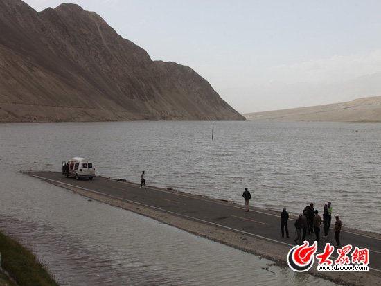 昨天采訪團接到邊防公安派出所山東老鄉路通電話,趕到前幾天水毀路段時,已經是20:30分。經過5天的緊急搶修,此時堰塞湖的水位緩慢消退到高底盤的大卡車勉強可以通過的程度。有著豐富自駕遠行經歷的領隊施曉亮與20多年駕齡的王偉商量后,決定跟著一隊大貨車涉水。但一下水二位自駕高手就有點后悔了:水淹路面完全與湖面混為一體,行車其上仿佛湖面行舟,有幾輛大貨車因為看不到水下的柏油路面而開下泡軟的路基,等待救援。公羊車的底盤雖然不算低,但有一段100多米的路段水深沒過大貨車車輪的一半,淹沒我們公羊車車輪的大半,而公羊車尾的排氣管完全淹沒在水中。如果停止加油,就有水進入排氣管被"淹"息火的危險,而持續加油則會與前方小心翼翼行駛的大貨車追尾。
