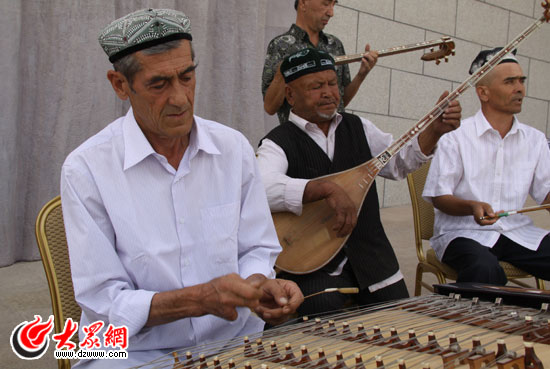 3日上午,在樓蘭博物館旁“樓蘭美女”的巨幅浮雕下,由若羌宣傳部、文化局特意為我們召集的10位若羌民間藝人共同彈唱一段傳統(tǒng)的《若羌賽乃姆》。八旬老藝人、《若羌賽乃姆》非遺傳承人哈斯木·玉素甫老人彈起冬不拉先以一段木卡姆獨(dú)唱開(kāi)場(chǎng),在一段粗獷渾厚低婉的歌聲后,曲調(diào)的節(jié)奏開(kāi)始加快,同時(shí),盤(pán)子(類(lèi)似古箏的樂(lè)器)、羌(類(lèi)似二胡小提琴的樂(lè)器)和手鼓等多種樂(lè)器一起演奏,樂(lè)隊(duì)所有彈奏著開(kāi)始齊聲合唱,這后面的合唱才是《賽乃姆》,在輕快的旋律中,民間藝人們將動(dòng)人的愛(ài)情故事、豐收的歡樂(lè)及人民英勇無(wú)畏的堅(jiān)強(qiáng)精神逐一歌頌。
