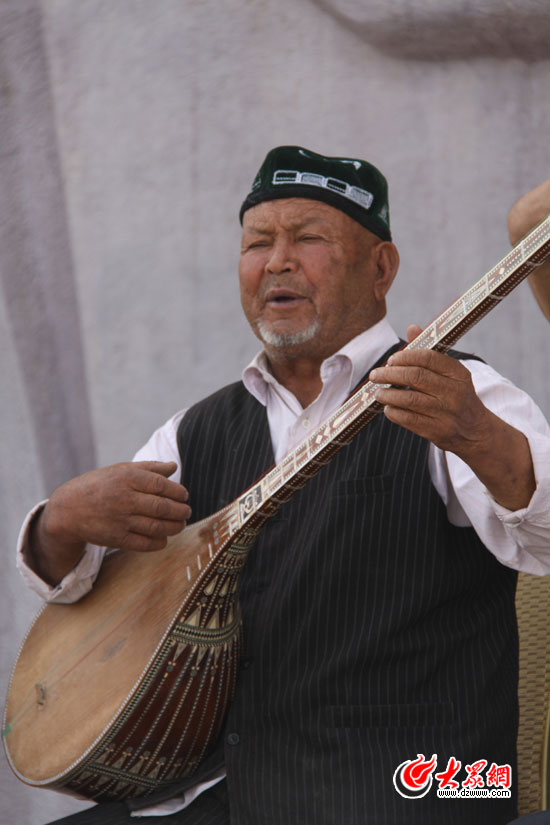 一位頭戴氈帽的維族老人彈奏著東不拉(類(lèi)似琵琶的樂(lè)器)