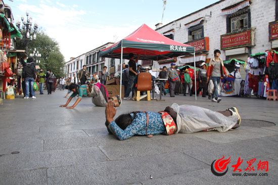 大眾網——聯通3G拉薩9月9日報道(記者 王磊)進藏前,就在網上聽說不管是文人墨客,還是遠方游客,來到拉薩如果不去八廓街那將是一種遺憾。八廓街又稱八角街,它是藏傳佛教信徒心中的“圣路”,又被稱為拉薩的“王府井”。9月8日清晨,“黨旗漫卷中國紅——走進56個民族家庭”接力式采訪團在休整了一天后,前日強烈的高原反應漸漸消退,我帶著興奮在八廓街上漫步,沿著這條拉薩最古老的轉經道向大昭寺走去。