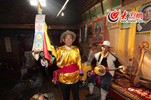 胡鏡明老人將寧蒗普米文化保護協會的幾位成員召集到自己家中,向記者展示普米族的傳統文化。胡老身后的這位彈唱普米傳統民歌的老人叫格桑次里,是位退休教師,現在也是”普米族傳統文化保護協會“的骨干