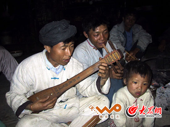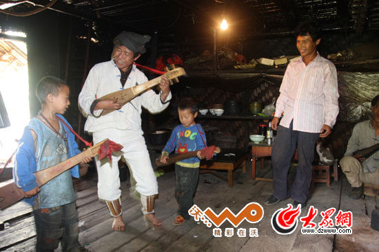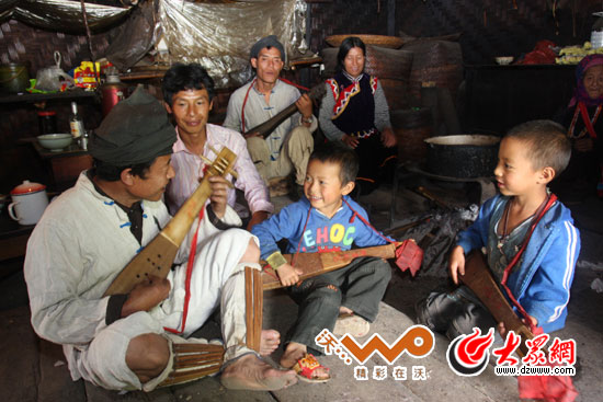 大眾網-聯通3G怒江10月21日訊(特派記者 王磊)8日下午,從貢山縣丙中洛結束獨龍族的采訪后,“黨旗漫卷中國紅——走進56個民族家庭”采訪團來到福貢縣架究村回訪怒族省級民間藝人歐得得。十年前,怒族民間藝人“歐得得”曾擔心自己將會是怒族最后一位能彈達底達變(怒族一種傳統四弦樂器)的歐得得;十年后,當包益四再次為采訪團彈奏歐得得時,他身旁多了一位伴舞的小歐得得,這個孩子名叫石江源,他是包益四的孫子,也是歐得得未來的希望。