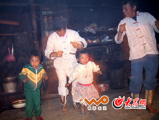 除了小外孫,歐得得在10年里還先后收了6個徒弟,他們都是附近幾個村的。為了配合我們錄像,他特地把最近一個村的一個跟他同齡的徒弟喊來,一起彈奏、歌舞。但在歐得得看來,要把畢生所學傳下去,還是小外孫石江源比較合適,因為他們能整天在一起。雖然石江源現在只能隨著旋律的偶爾哼唱幾句“歐得得”,但是歐得得對自己的小外孫充滿了信心,他有自己的培養計劃,小江源現在有自己的一把達底達變,雖然還沒有安上弦,但是每當爺爺彈奏的音樂一起,小孫子的小手還是有模有樣地彈奏起來。歐得得說,將來他還要送小外孫去讀書考大學,這樣他就能走出大山,教更多的人彈奏達底達變。