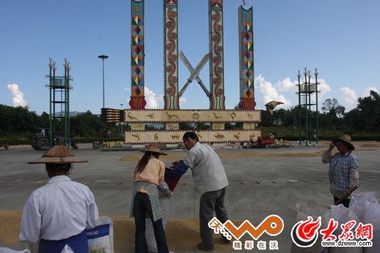隴川縣城里的“景頗風(fēng)情廣場(chǎng)”。正值秋收,這里成了百姓曬糧食的好地方。