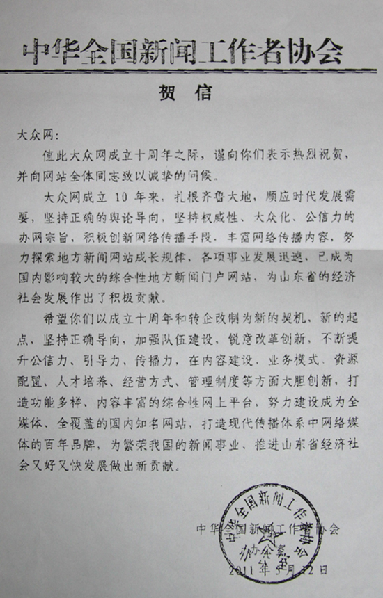 [提要]   值此大眾網成立十周年之際,謹向你們表示熱烈祝賀,并向網站全體同志致以誠摯的問候。大眾網成立10年來,扎根齊魯大地,順應時代發展要求,堅持正確的輿論導向,堅持權威性、大眾化、公信力的辦網宗旨,積極創新網絡傳播手段,豐富網絡傳播內容,努力探索地方新聞網站成長規律,各項事業發展迅速,已成為國內影響較大的綜合性地方新聞門戶網站