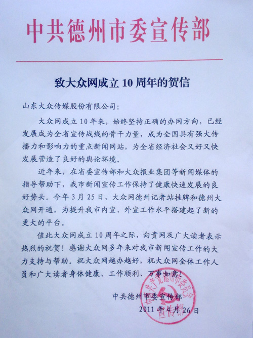 德州市委宣傳部賀信