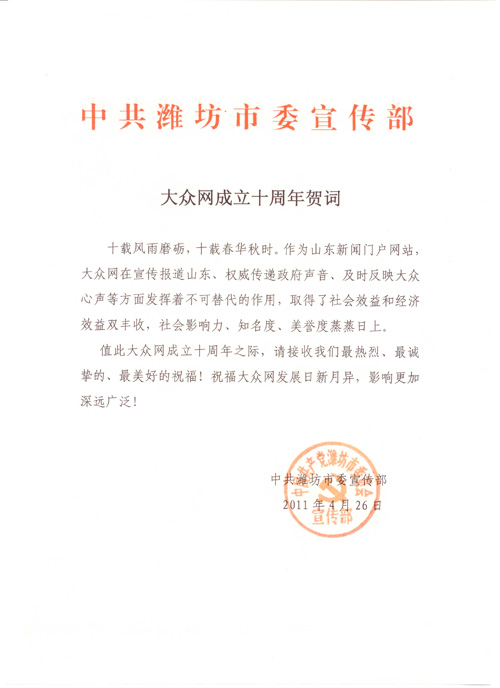 濰坊市委宣傳部賀信