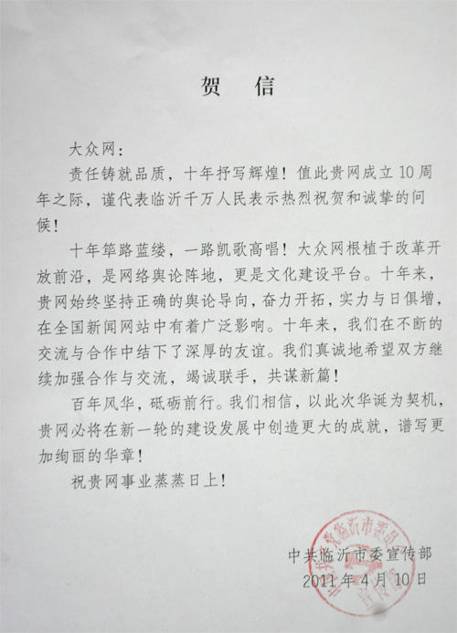 臨沂市委宣傳部賀信