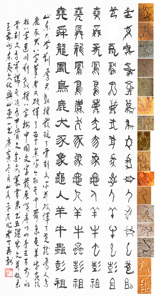 2010年9月5日,丁再獻登門造訪劉教授后,開始更深入的研究破譯,并查找出諸多實物佐證。丁再獻對文字研究資料情有獨鐘。當他接觸到山東大學劉鳳君教授的骨刻文研究時,對骨刻文中一組一組的形象圖案產生了濃厚興趣,憑其多年來對書法和書法理論的研究知識,不僅從130件骨刻上破譯了100多個象形字和會意字,還大膽提出了自己的主張:山東是東夷文化的發源地,東夷人首先創造了骨刻文字,很可能是中國漢文字的源頭!