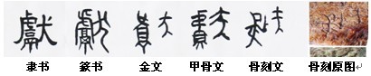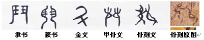 從昌樂(lè)骨刻中可以看出,許多動(dòng)物和飛禽都繪制的很形象而逼真。例如昌樂(lè)骨刻文36號(hào)中是一幅林野中歡快百態(tài)的群鳥圖,66號(hào)中一片竹林邊一只山羊與一只仙鶴正在戲耍,67號(hào)中一頭牛正在悠然自得的前行,72號(hào)中一只幼鹿回頭圖被刻畫的惟妙惟肖,而3號(hào)中的“狐”、13號(hào)中的“蟲”、14號(hào)中的“馬”、“犬”、16號(hào)中的“鳥”、42號(hào)中的“兔”、54號(hào)中的“鼠”、66號(hào)中的“羊”、67號(hào)中的“牛”等,都頗為形象。筆者研究發(fā)現(xiàn),這些均被甲骨文和金文所借鑒,有的基本上原樣成字。可以看出,長(zhǎng)期以來(lái),東夷人與動(dòng)物和平共處,與動(dòng)物相互影響,而且很多動(dòng)物的行為被人類所借鑒,動(dòng)物文化也被文化動(dòng)物所研究,并且還據(jù)此創(chuàng)造出了中國(guó)最早的文字。而同一時(shí)期的周邊文化雖有類似文字的符號(hào)出現(xiàn),但均與六書之首的象形字相去甚遠(yuǎn),距離演變成漢字還有較遠(yuǎn)的路程,極有可能在漢字演化過(guò)程中被優(yōu)化掉了。而東夷半文半畫的“形象畫”則被首選為“象形字”。