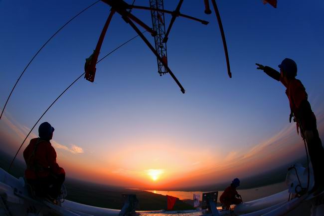 施工人員在特高壓工程長江大跨越進行鐵塔組立