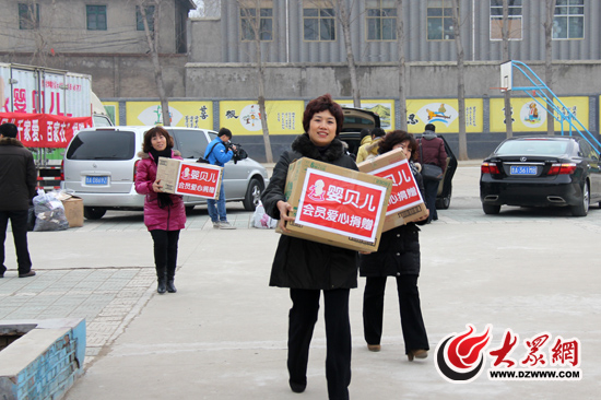 濟南嬰貝兒母嬰購物廣場董事長劉長燕等搬著一箱箱的愛心衣送到孩子們的教室
