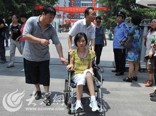 考生小蘇稱骨折不影響高考 最感謝父親 語文考試結束后,考生小蘇坐輪椅離開考場。父親蘇先生告訴記者:“小蘇3月底發生意外,從樓梯上摔下,左腳骨折,不能落地。至今已有兩個多月了。”考完第一場,小蘇表示語文題目不難:“雖然受傷了,但是對我的考試沒影響,考的還不錯。感謝我的父親。” 據了解,小蘇和父母目前租住在山師北街4號,考前上下樓、上課等均由其父親抱或用輪椅推行。(記者 隋喬)